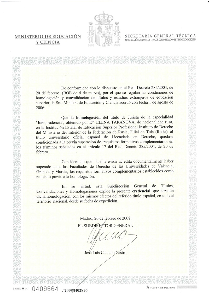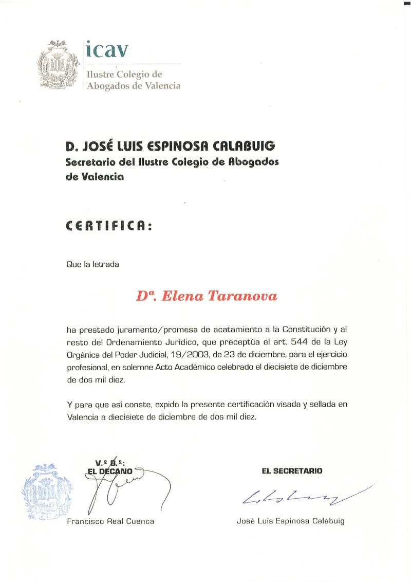2009 - Член коллегии адвокатов города Валенсия ICAV 14.219