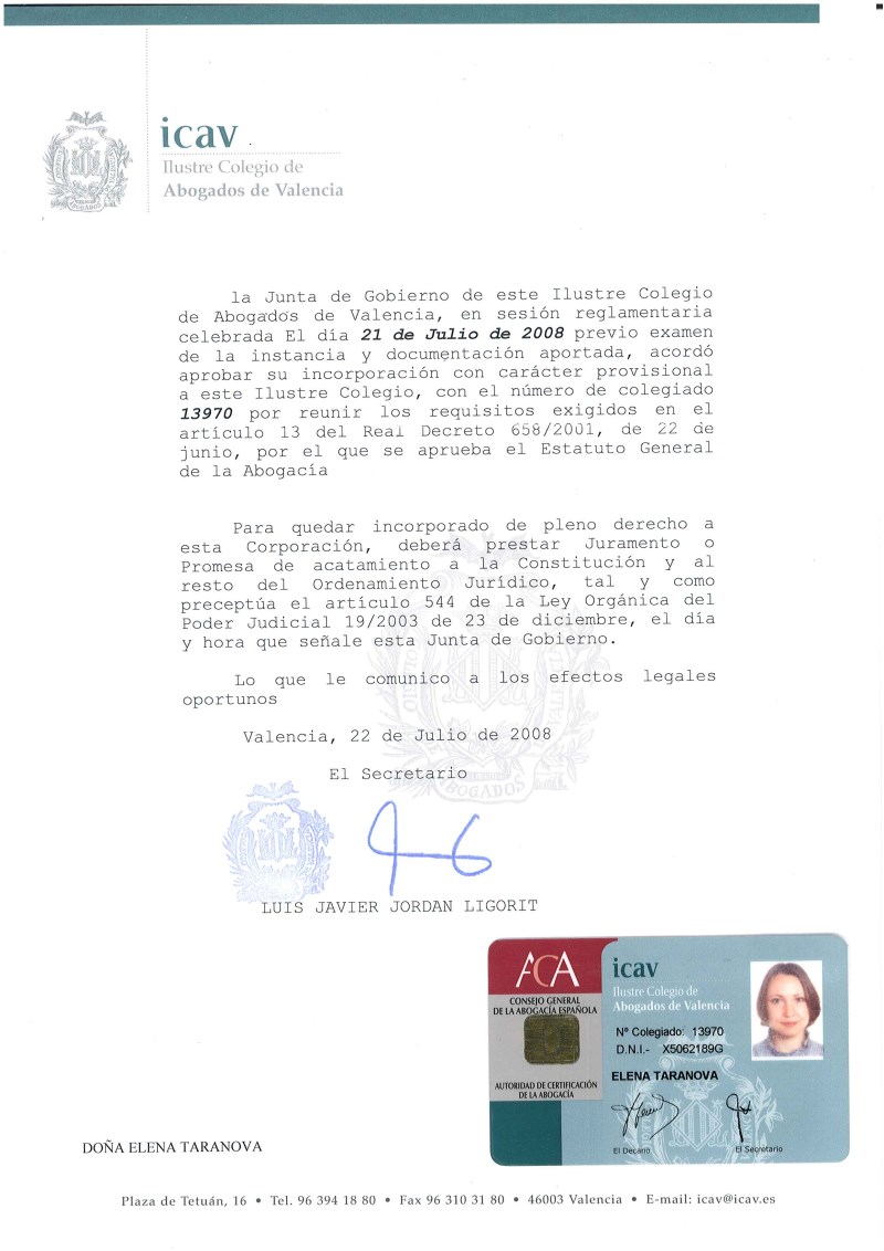 Член коллегии адвокатов г. Валенсия, лицензия № 14.219
